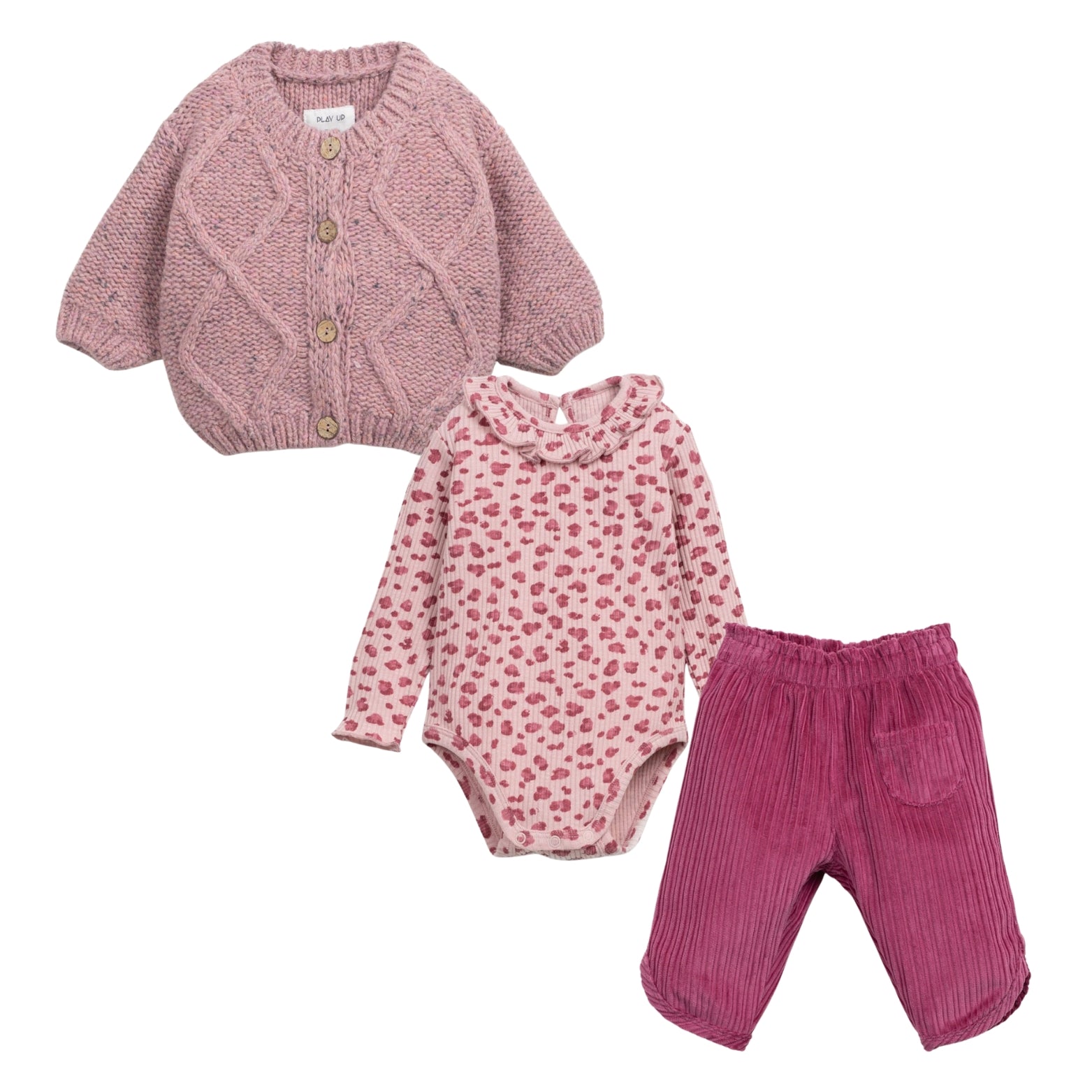 Set of 3 | Wool-blend Pale Pink Cardigan & Ruffle Leo Bodysuit & Berry Pink corduroy Pants