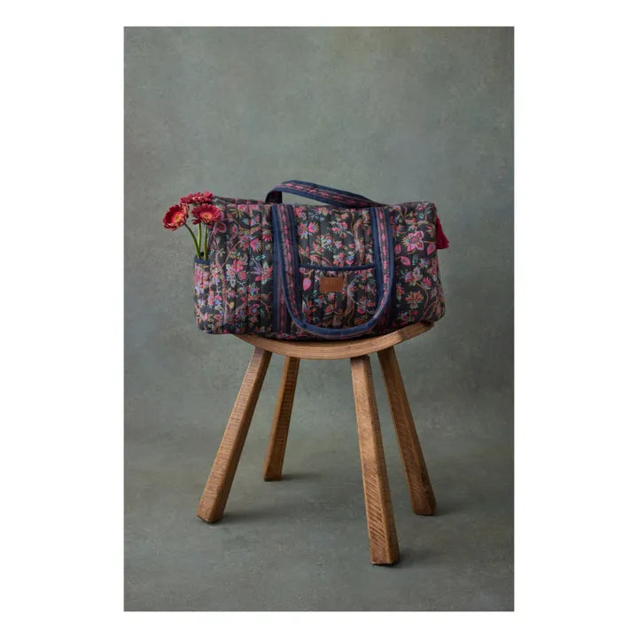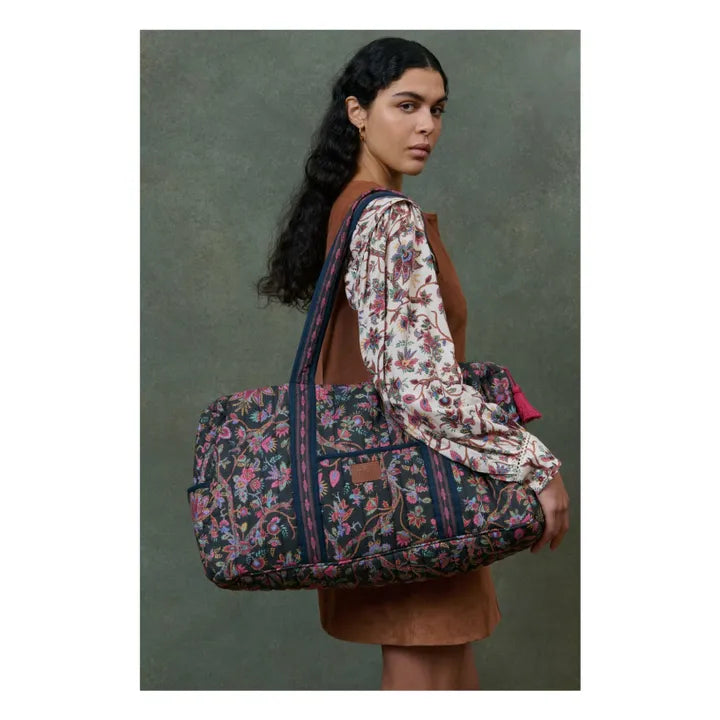- Quilted cotton voile travel bag. Floral print and frieze detail. 3 outside pockets. 2 inside pockets. Embossed leather patch. Wide handles. Zipper opening. Two colorful handmade pompoms. Striped water-repellent lining. Designed in Paris by Marie Pidancet and her team.