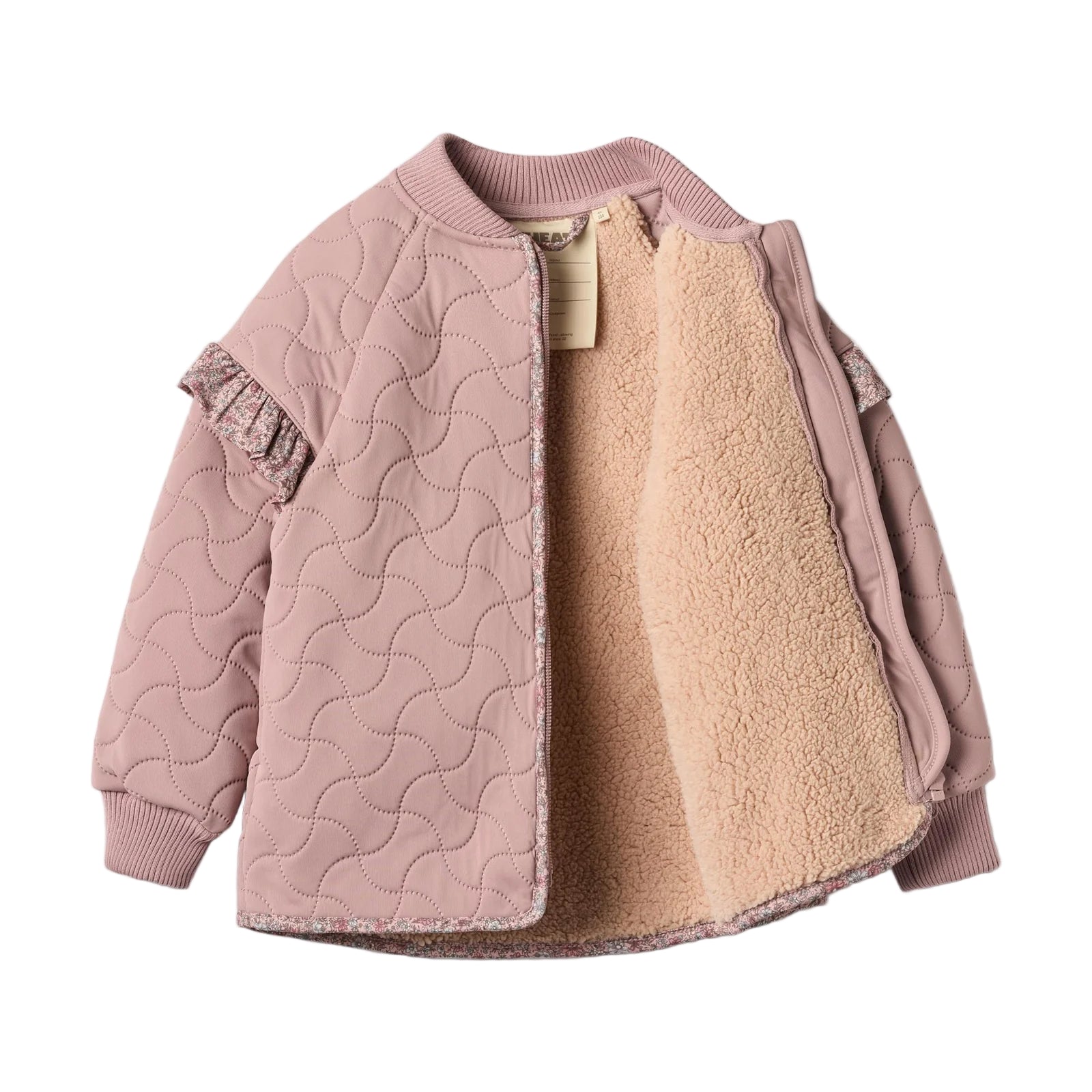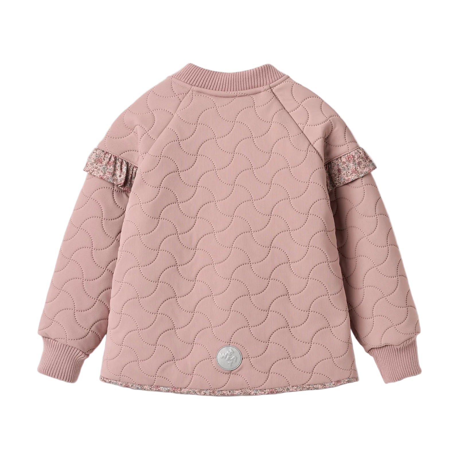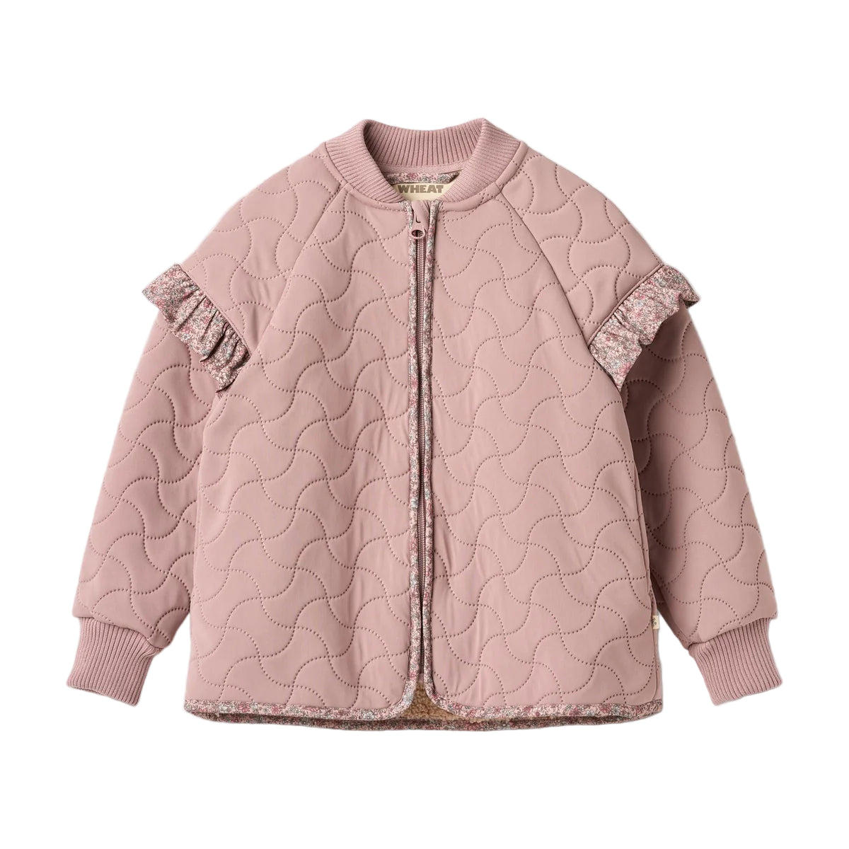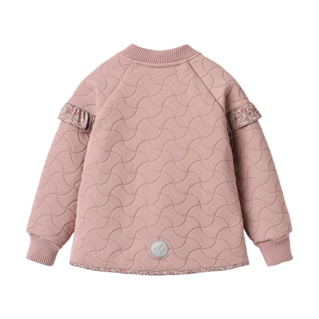 Known for its clean lines and soft palettes, Wheat brings everyday ease to kidswear. The water-repellent jacket comes in a light pink-hue and features charming floral-printed ruffle details at the shoulders.