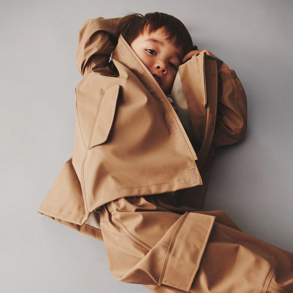 Known for its clean lines and soft palettes, Wheat brings everyday ease to kidswear. The pants are designed with a technical, waterproof design and feature adjustable elastic bands under the feet.
