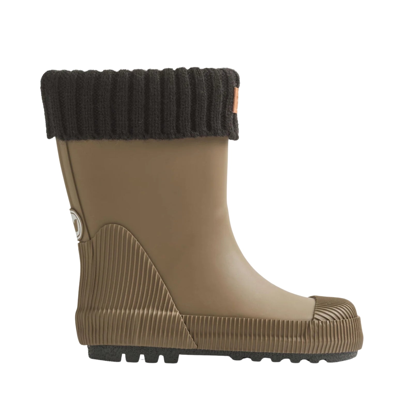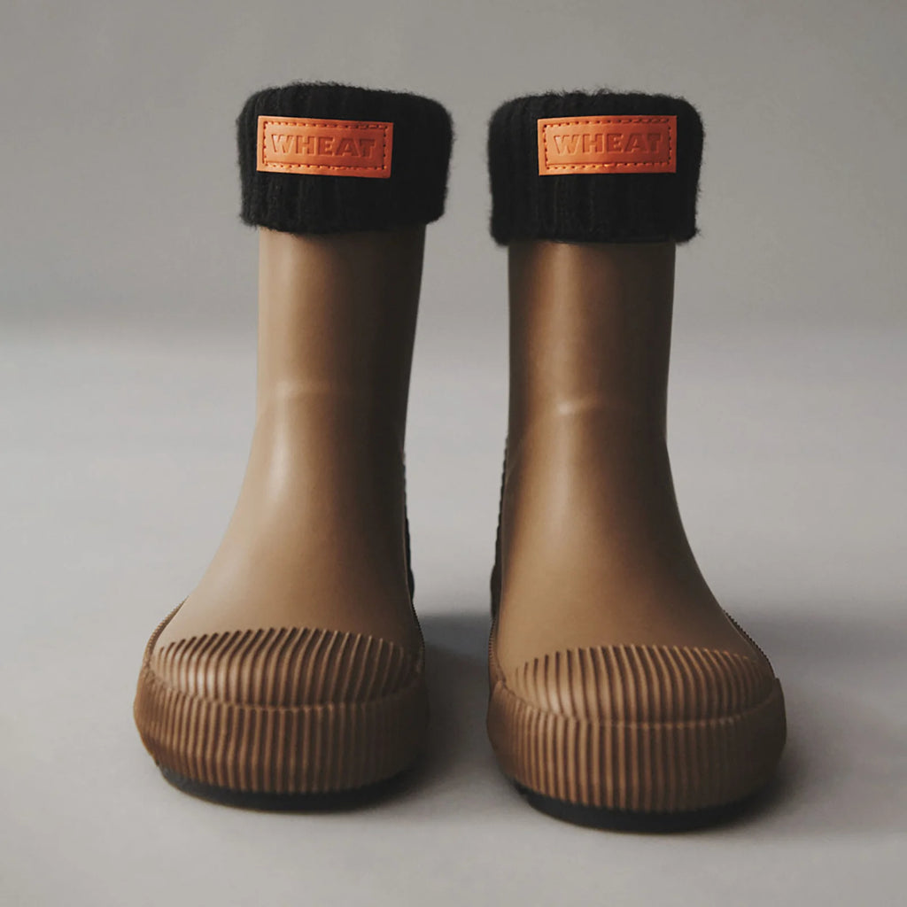 The Danish brand Wheat combines minimalist charm with sustainable, high-quality materials designed for freedom of movement and long-lasting wear. These rubber rain boots feature rounded toes, a removable plush lining, and a contrasting logo patch.