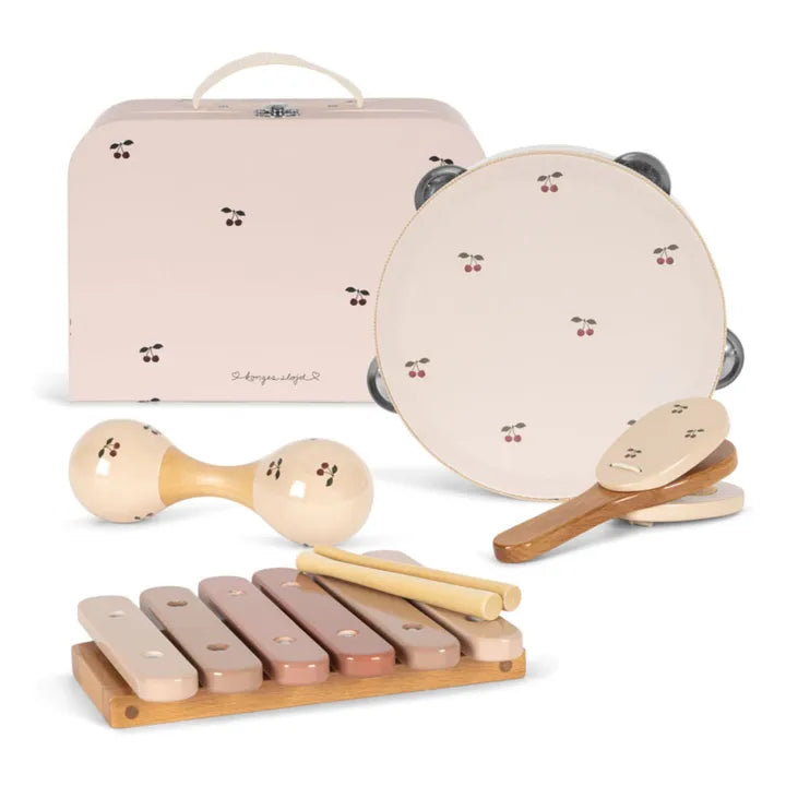 - Set of high gloss music instruments, including tambourine, castanet, maracas, and a xylophone with drumsticks. The instruments come in a little suitcase.