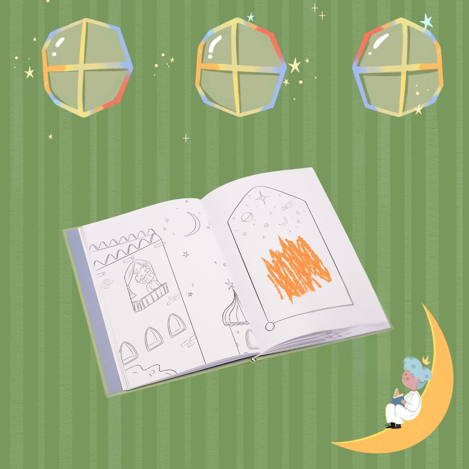 يحتوي الكتاب على 30 صفحة تلوين تمثل 30 يومًا من رمضان
