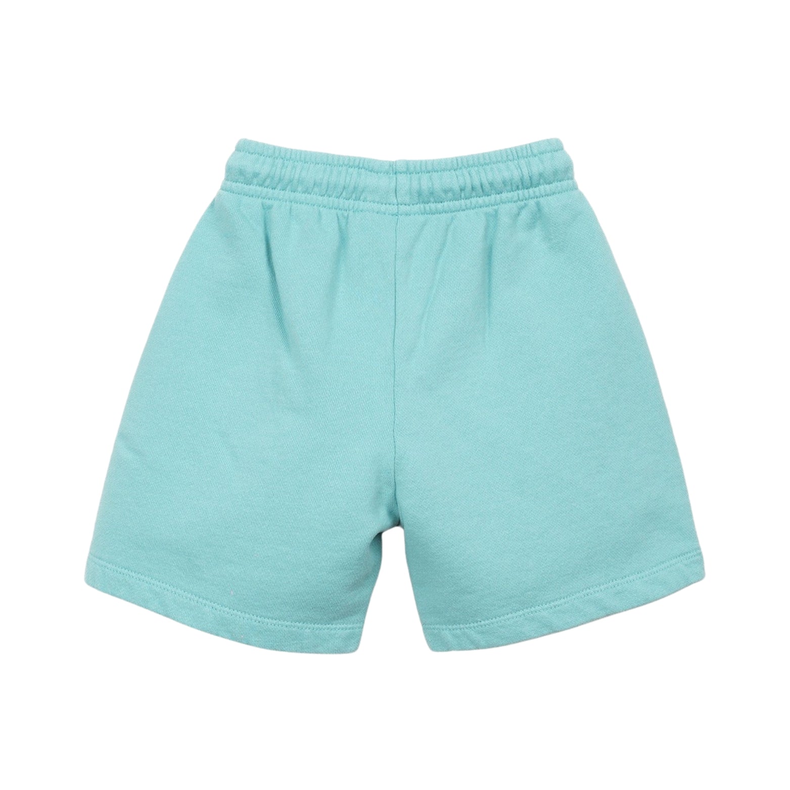 These shorts are made of organic cotton in Turquoise color. They feature a model with an adjustable drawstring belt, pockets, and a front design detail.