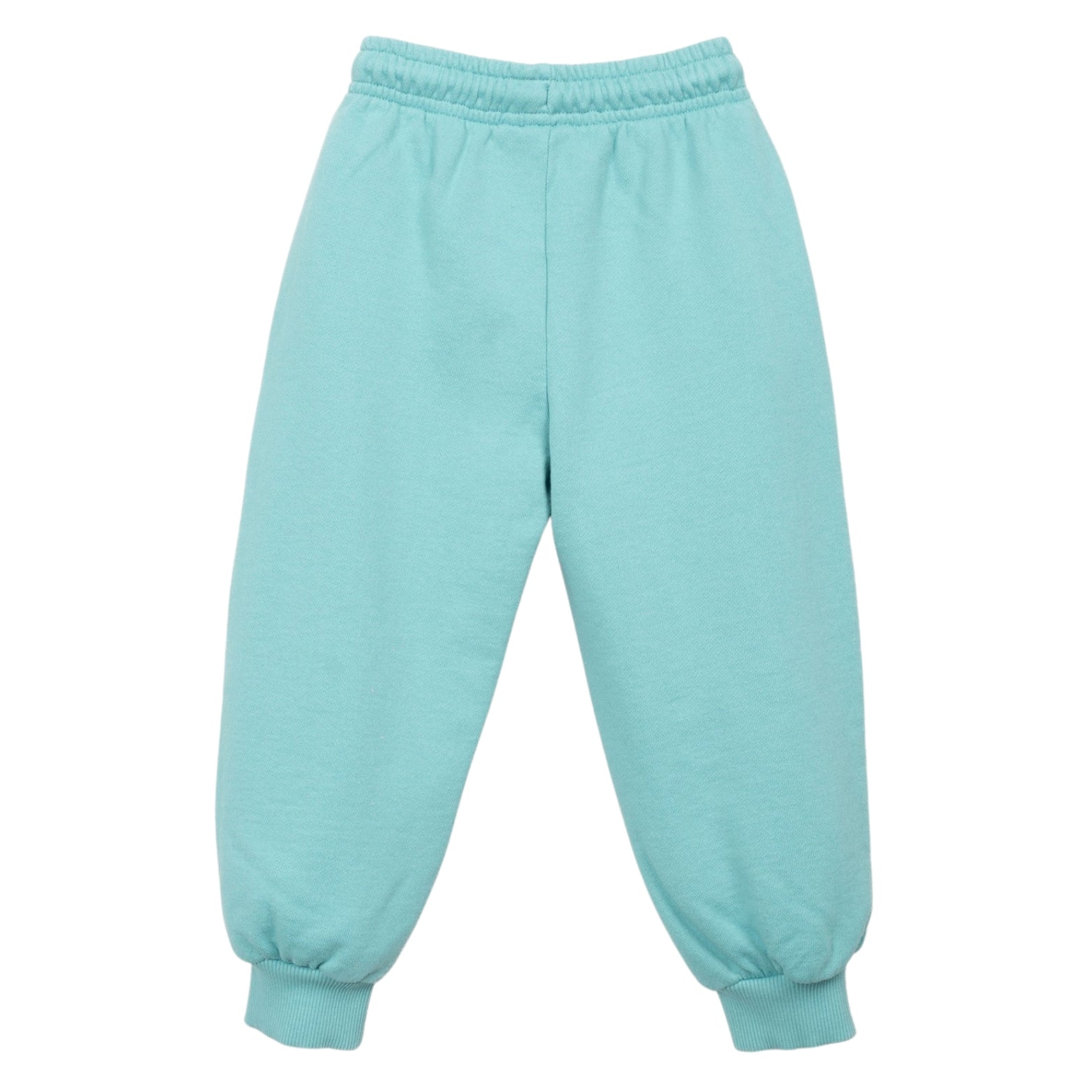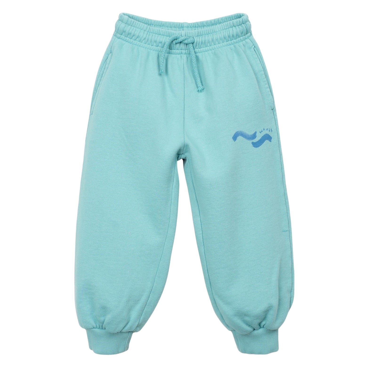 These trousers are made from organic cotton jersey, in Turquoise color. They feature an adjustable belt, elastic cuffs, and a front print. This piece was designed for transformation and growth, allowing it to be worn longer by the same child. Cut the leg at the horizontal mark in a slightly darker shade to turn them into shorts.