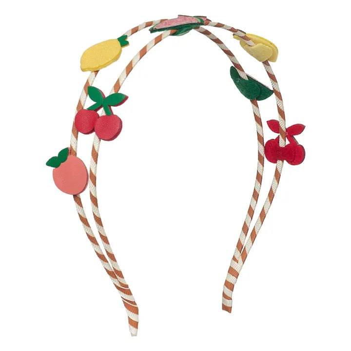 - Our double headband features two bands of super delicious fruits including watermelon, cherries, lemons and oranges - perfect for those summer picnics! Wrapped in a stripy ribbon, this headband is designed to provide a comfortable fit for little heads.