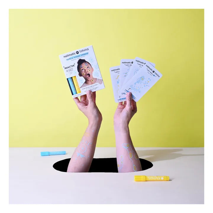 This set is ideal for experimenting with drawing on skin. The felt-tips are easy to remove, and designed for fun: try them out, erase them, catch up...They're easy to handle, so you can imagine all kinds of patterns and color them in. There's no limit to the fun!