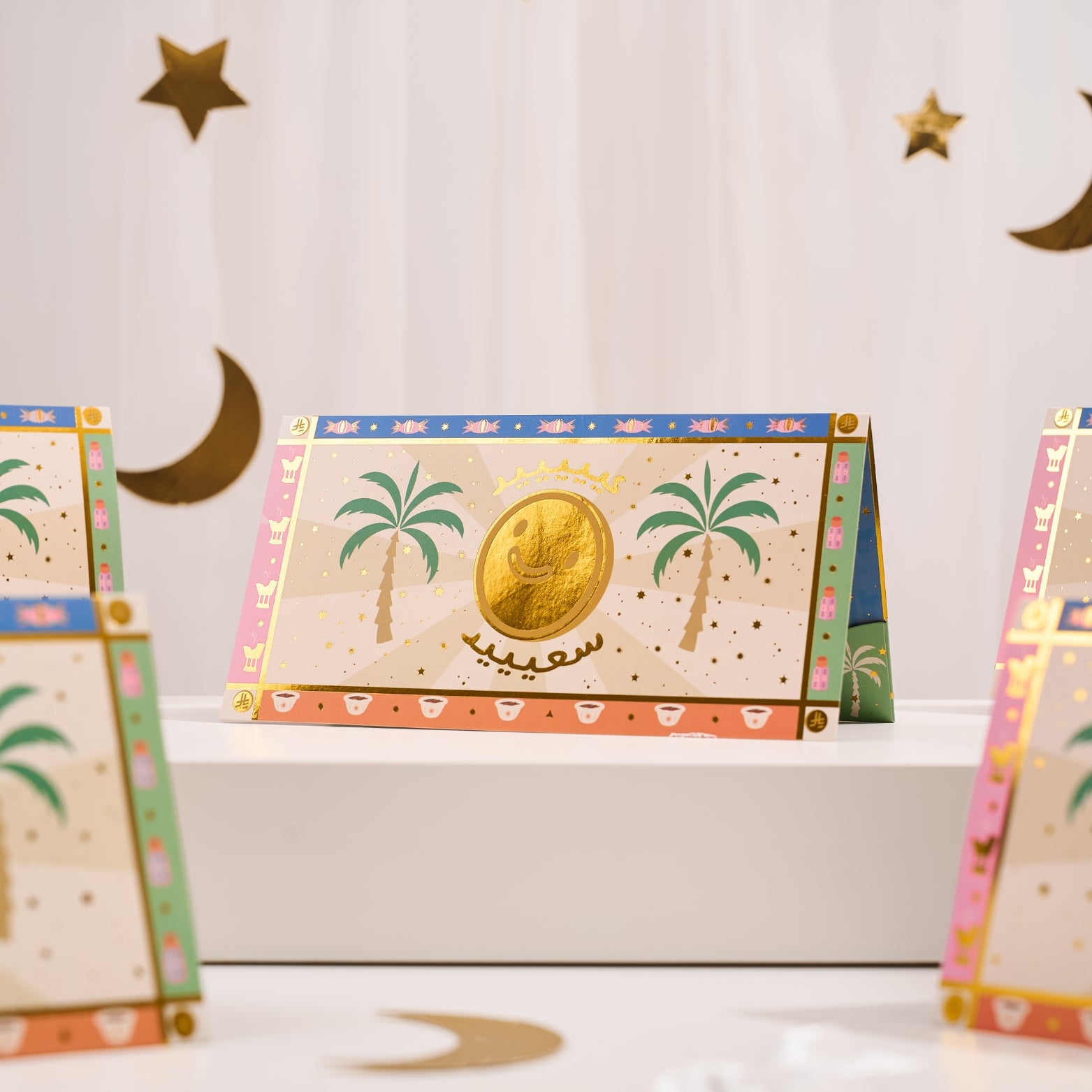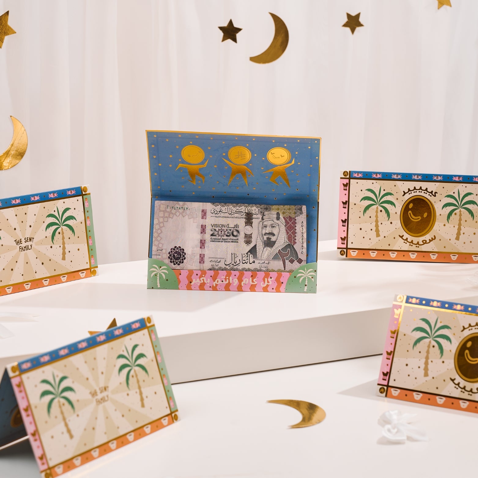 Designed for the joy of Eid gifting, this set of five Eidia money envelopes brings sparkle to every celebration. Each envelope features exclusive hand-drawn artwork by The Sent Family, paired with luxurious gold-foil stars for a festive shine.