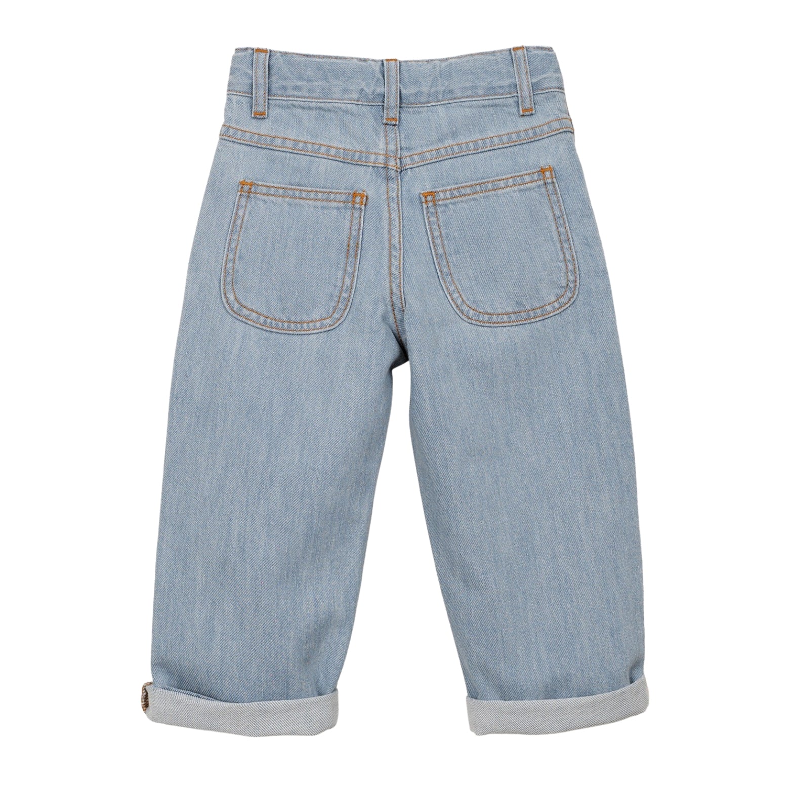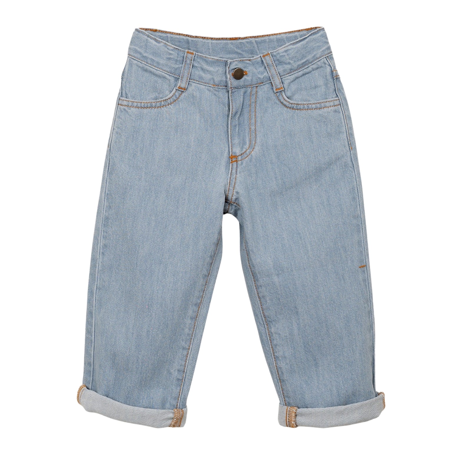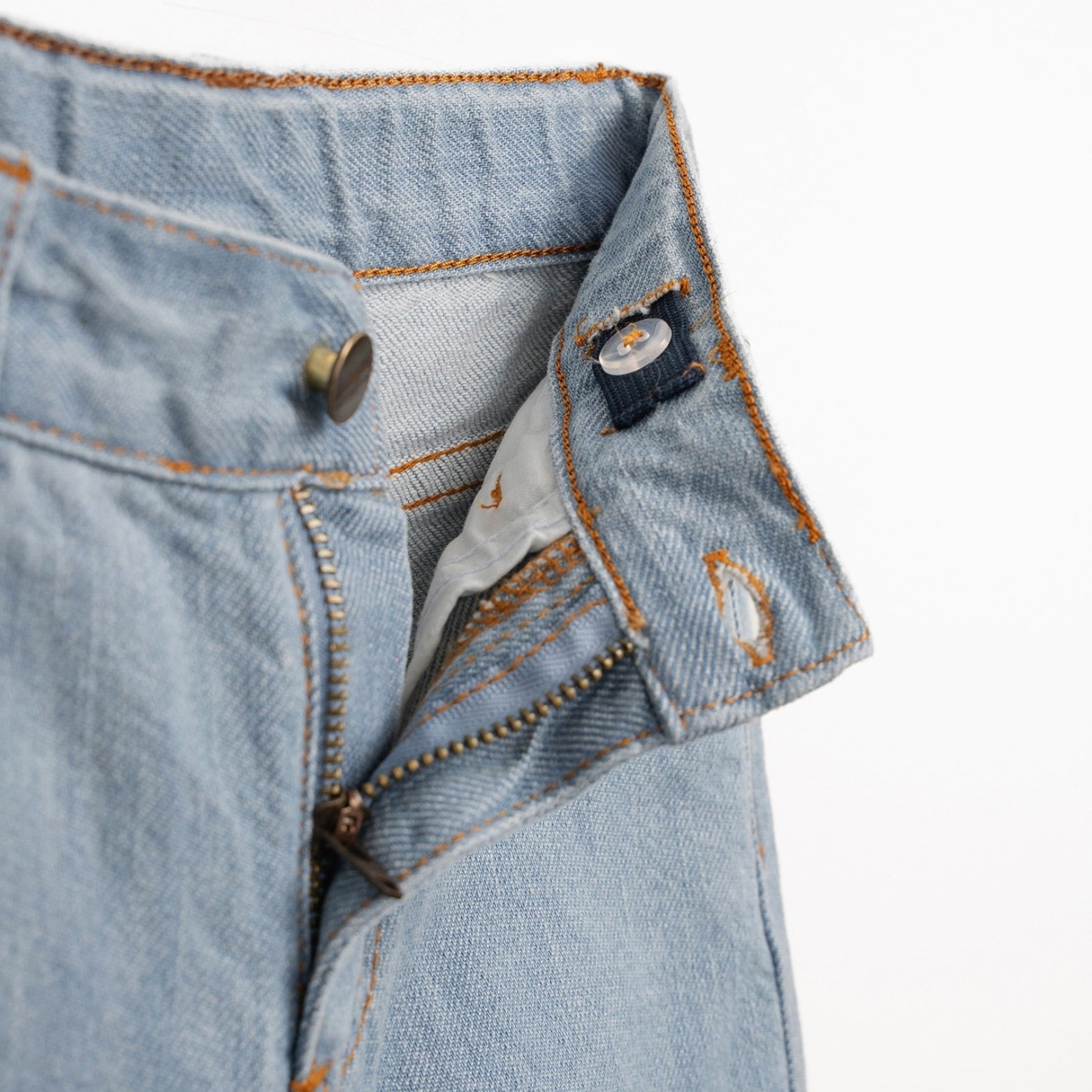 These trousers are made of cotton fabric in Denim color. They feature an adjustable waistband on the inside, a nickel-free metal button and zip fastening, front and back pockets. This piece has been designed for transformation and growth, so it can stay with the same child for longer. Cut the pant leg along the horizontal line in a slightly darker shade to turn it into a pair of shorts.