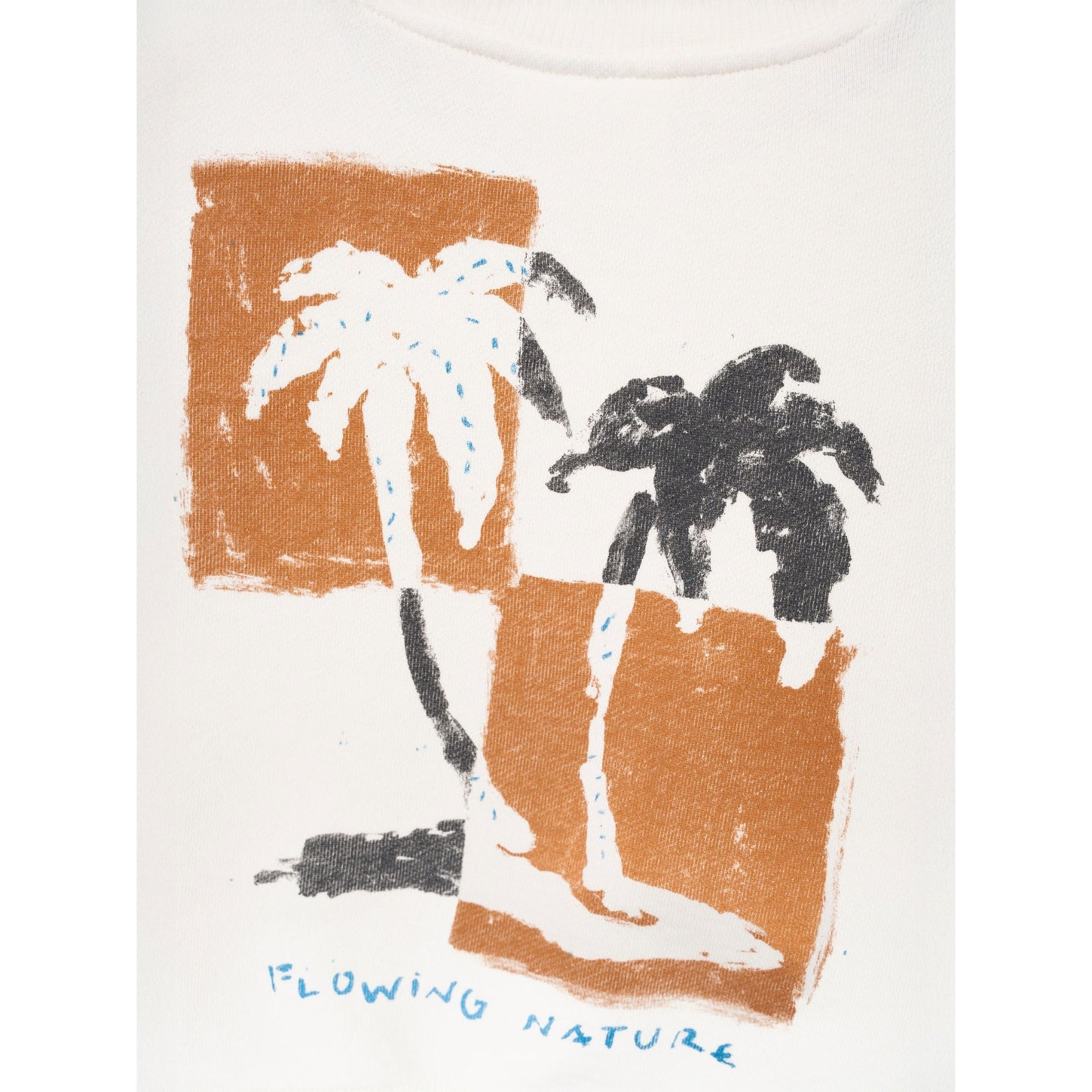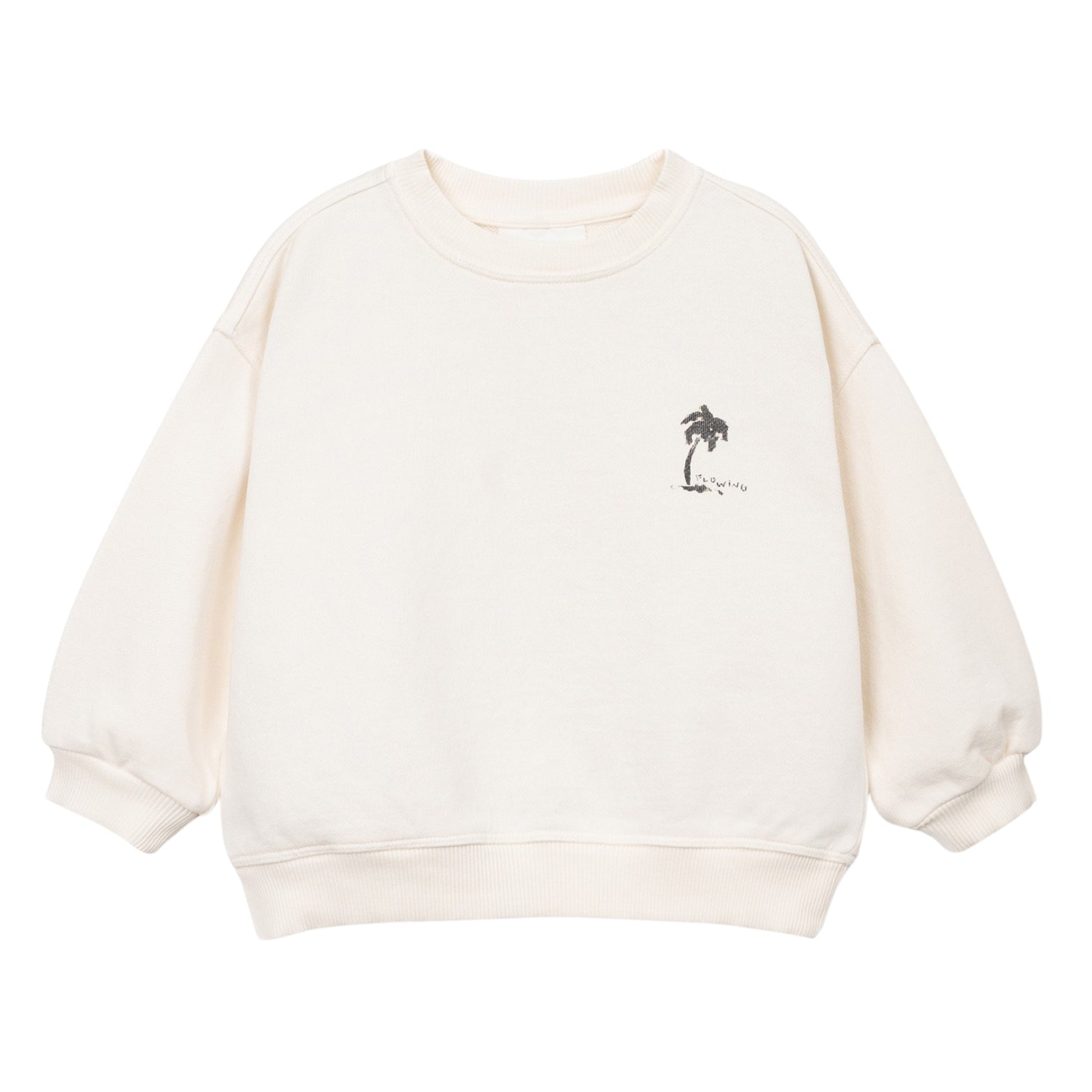This sweatshirt is made of organic cotton, in the color Raw. It is a model with a round neckline and long sleeves, elastic cuffs and waistband, and an illustration on the back.