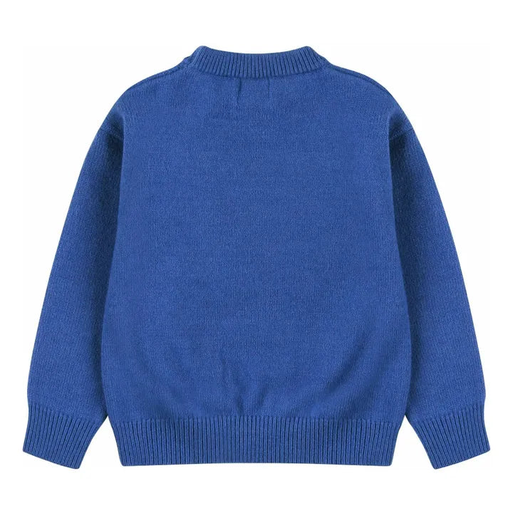 Jellymallow, which gets its name from a combination of "jelly" and "marshmallow", designs pieces that capture the innocence and wonder of childhood. Funky heartglasses adorn this blue sweater, knitted in a relaxed silhouette.