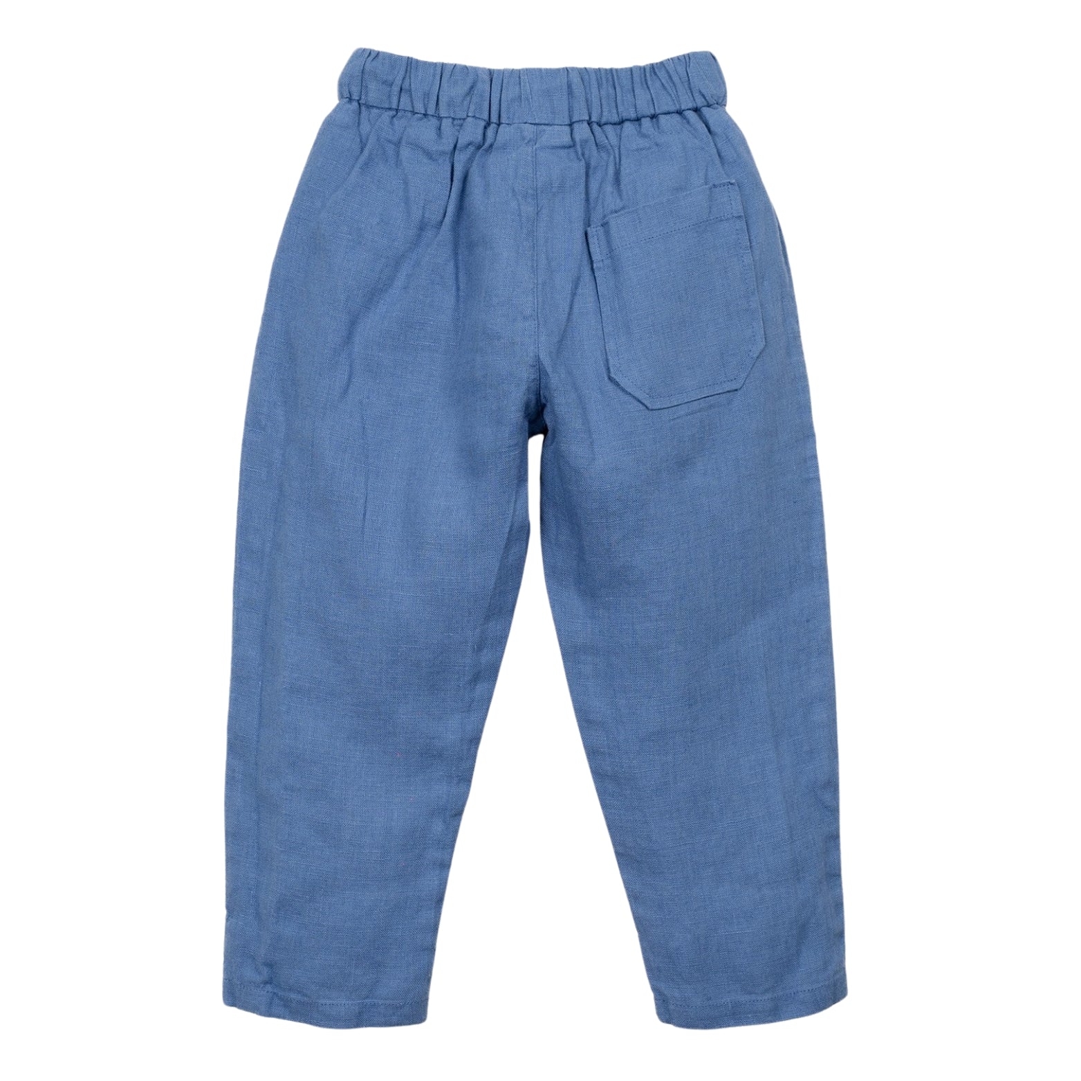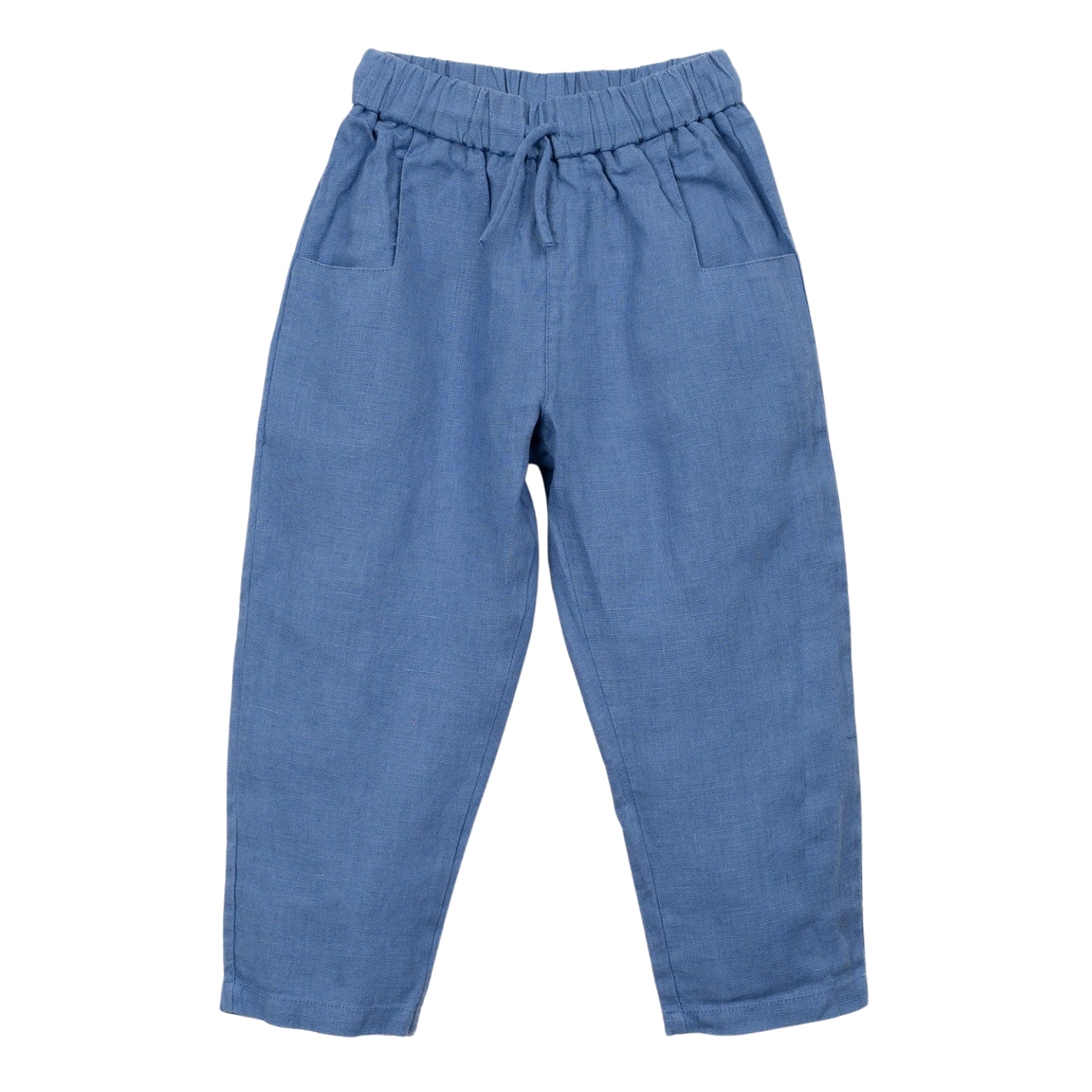 These trousers are made of linen in Dark Blue color.They feature an elastic waistband, adjustable drawstring, front pockets and one back pocket. This piece was designed for transformation and growth, allowing it to be worn longer by the same child. Cut the leg along the slightly darker horizontal mark to turn it into shorts.