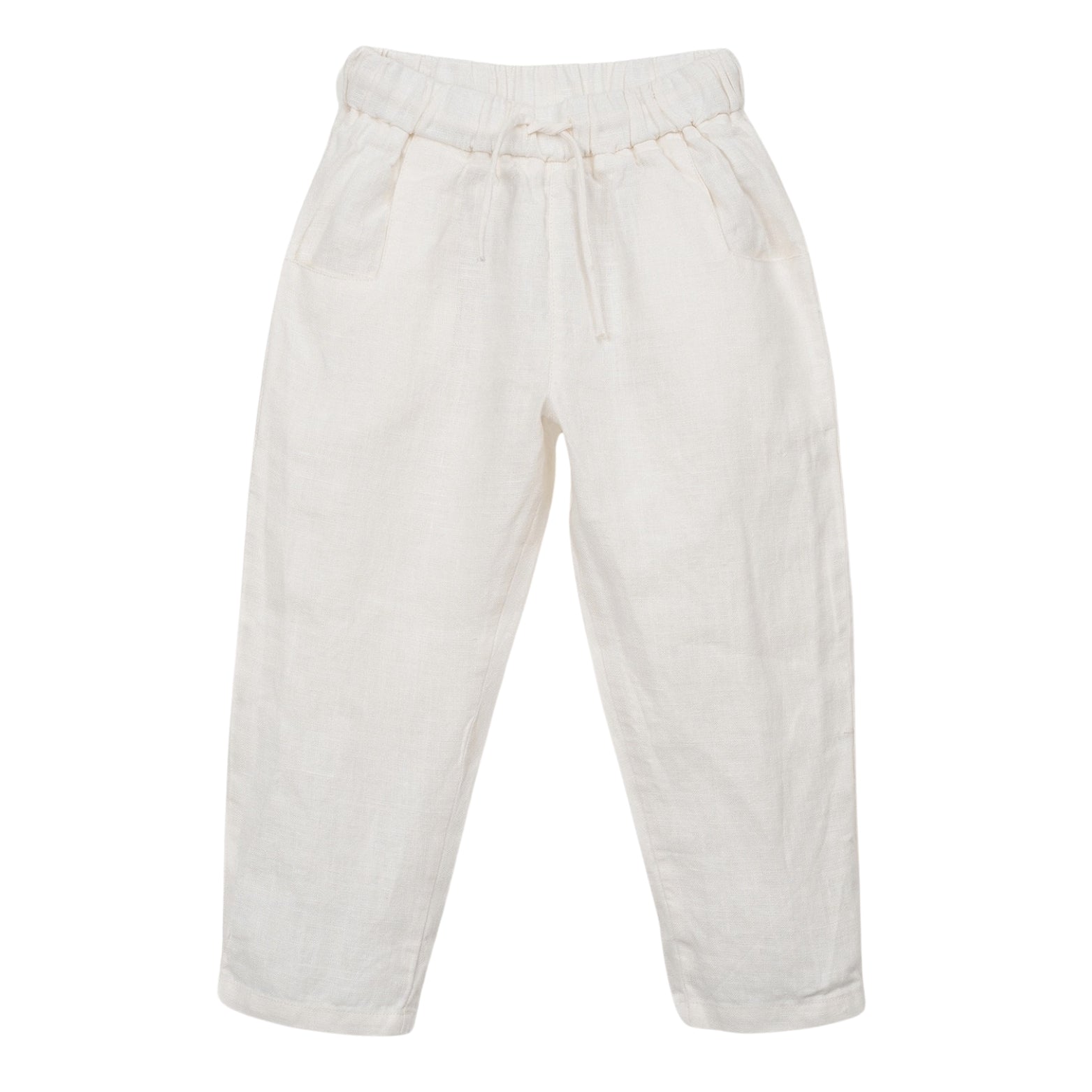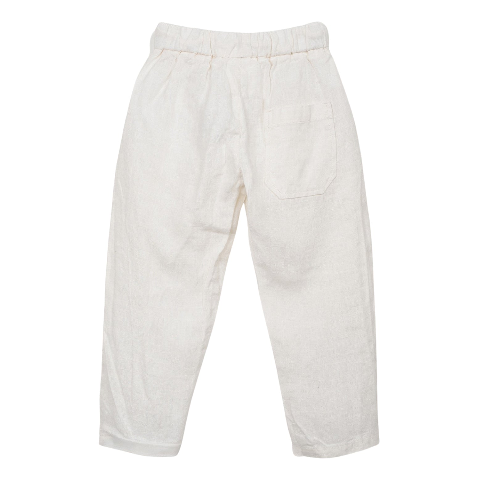 These trousers are made of linen, in the color Cru. They feature an elastic waistband, adjustable drawstring, front pockets and a back pocket. This piece was designed for transformation and growth, allowing it to stay with the same child for longer. Cut the leg at the slightly darker horizontal mark to turn it into a pair of shorts.