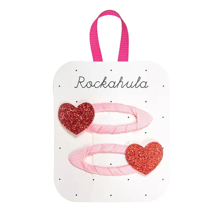 - A pack of two scarlet red glittery hearts, set upon pretty pink grosgrain ribbon wrapped snap clips. These glittery heart shaped clips are loveable in every way!
