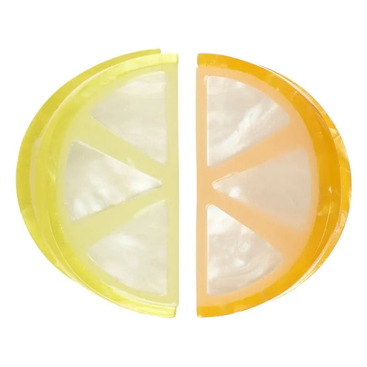 - Look sharp in these bright citrus claw clips! Designed with little ones in mind, this set of two slices of lemon and orange claw clips are a fabulous addition to any hairstyle! Made in shimmery bright acetate, with little grippy teeth to hold hair in place.
