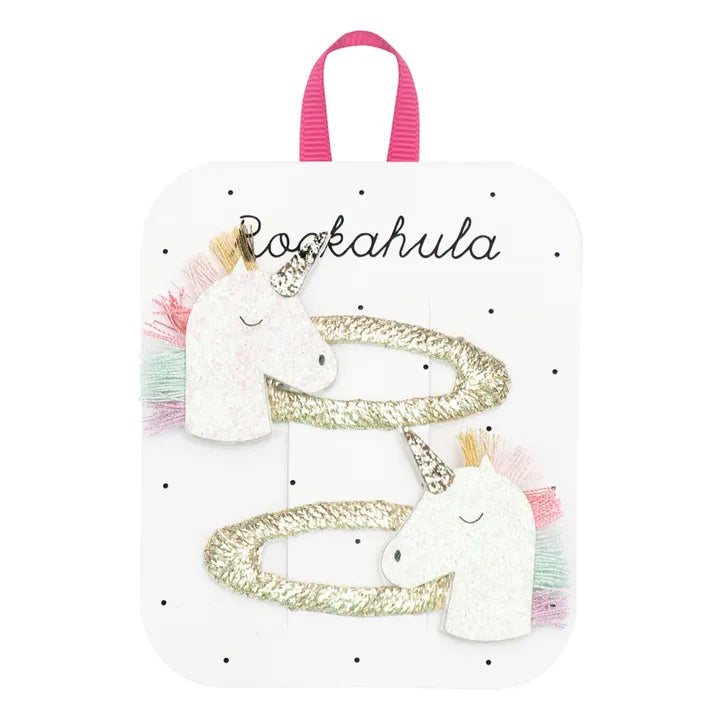- Two of our favourite things ... rainbows and unicorns! Our magical unicorns are made in enchanting white glitter and have a brightly coloured mane and glittering horn! Both sat upon gold ribbon wrapped snap clips. We believe in rainbow unicorns ... and so can you!
