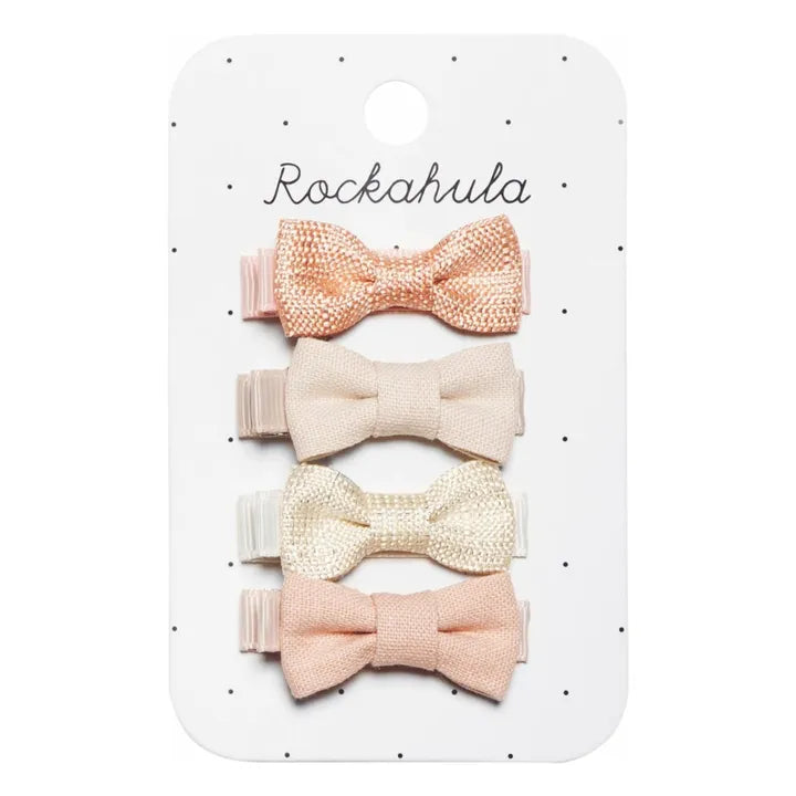 - In a palette of soft pinkcolours,these prettylinen bow clips are designed for acomfortable fit. With fourlittle hand-tied fabric bows, each clip is wrapped in soft grosgrain ribbon. Wear them one at a time, or all together!