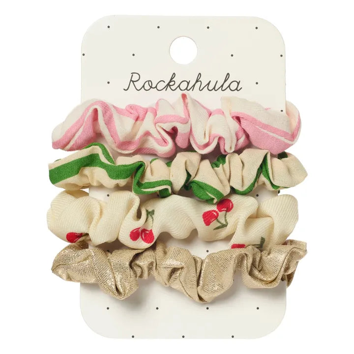 A pack of four sweet and fun scrunchies, each in a different beautiful fabric. Featuring our sweet cherry fabric, a stripy pink, and a stripy green fabric and a shimmering gold fabric - these are the perfect scrunchies for summery adventures.