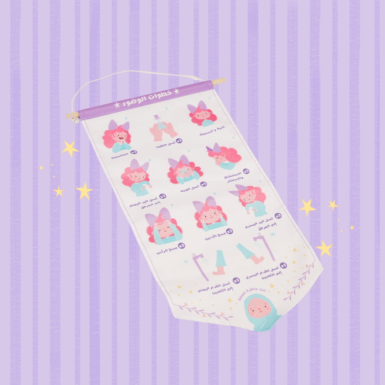 تعليقة تعليمية بسيطة وملوّنة تُعرّف طفلك على خطوات الوضوء بطريقة لطيفة وسهلة الفهم.